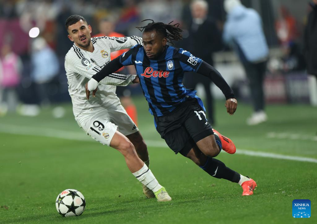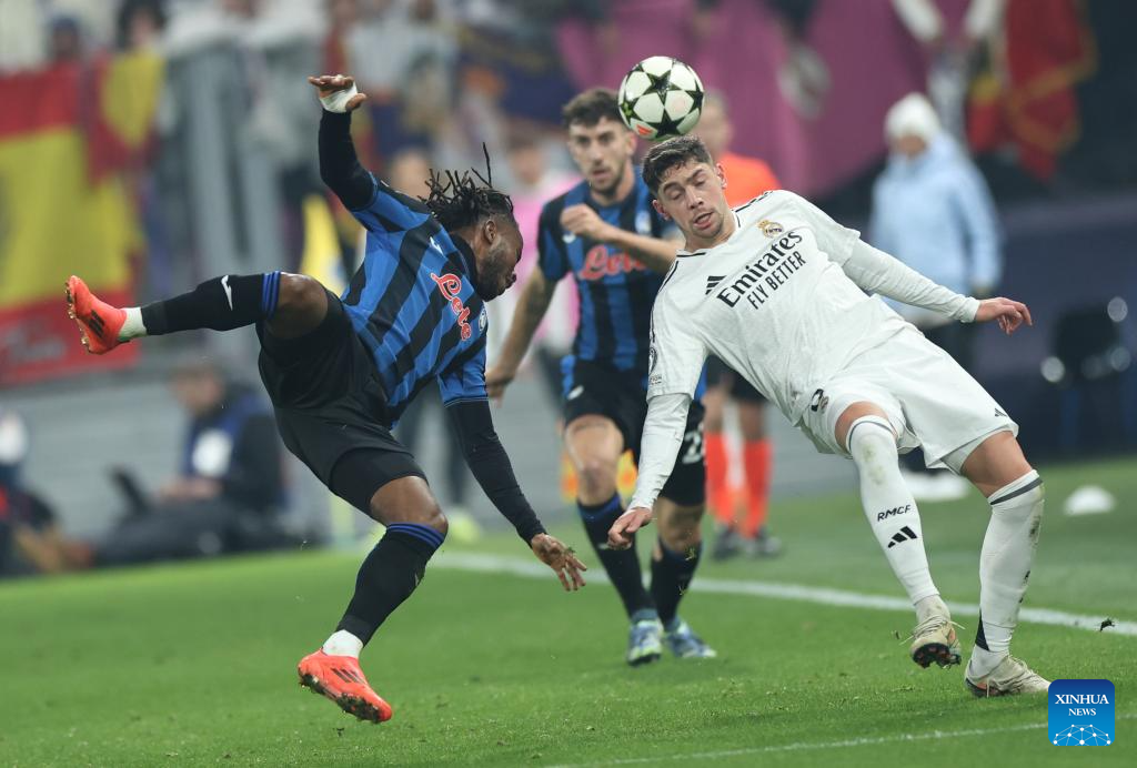 Atalanta's Ademola Lookman (L) vies with Real Madrid's Federico Valverde during the UEFA Champions League match between Atalanta and Real Madrid in Bergamo, Italy, Dec. 10, 2024. (Xinhua/Li Jing)