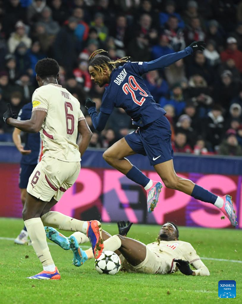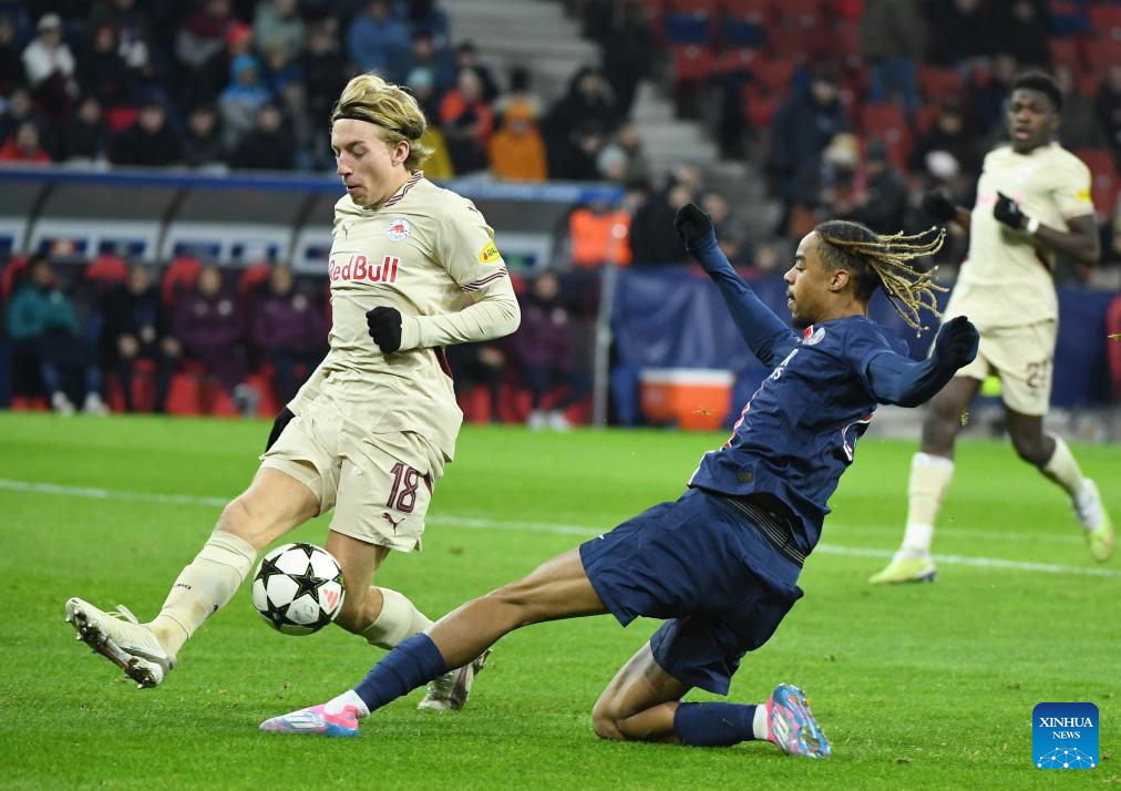 Bradley Barcola (top) of Paris Saint-Germain competes during the UEFA Champions League match between FC Salzburg and Paris Saint-Germain in Salzburg, Austria, Dec. 10, 2024. (Xinhua/He Canling)