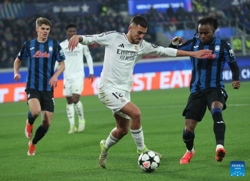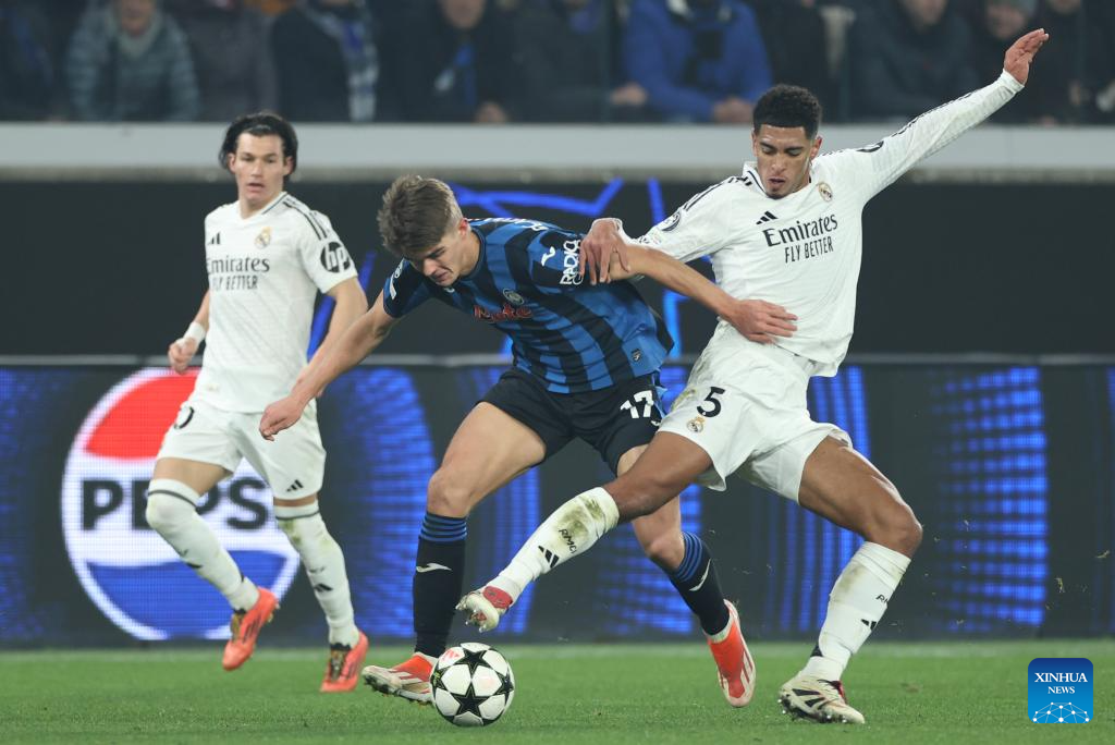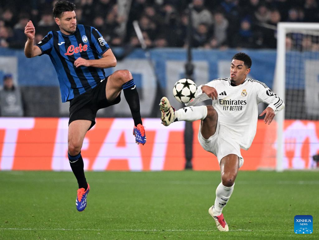 Real Madrid's Jude Bellingham (R) vies with Atalanta's Charles De Ketelaere (C) during the UEFA Champions League match between Atalanta and Real Madrid in Bergamo, Italy, Dec. 10, 2024. (Xinhua/Li Jing)