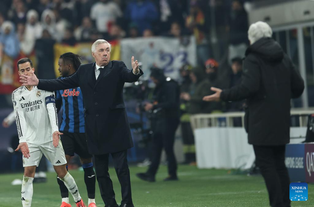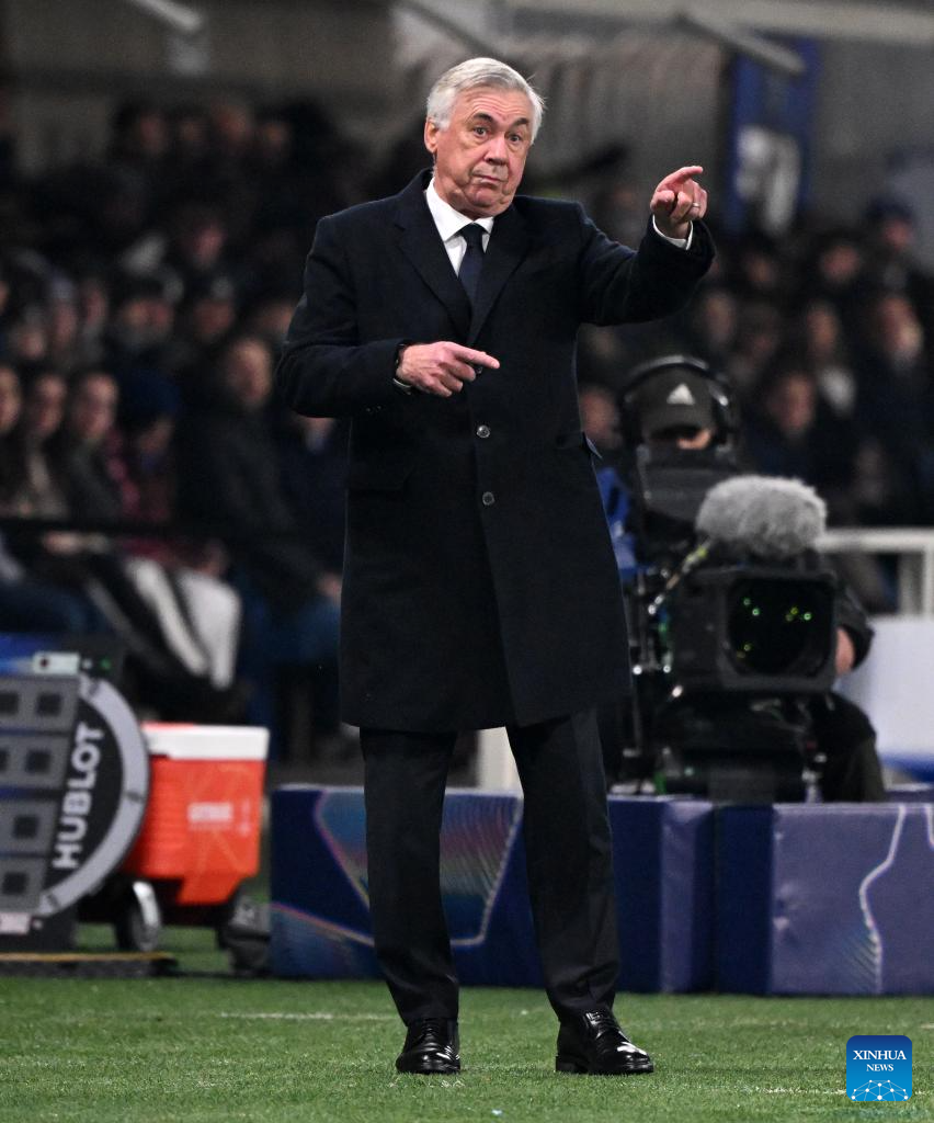 Real Madrid's head coach Carlo Ancelotti (3rd L) gestures during the UEFA Champions League match between Atalanta and Real Madrid in Bergamo, Italy, Dec. 10, 2024. (Xinhua/Li Jing)