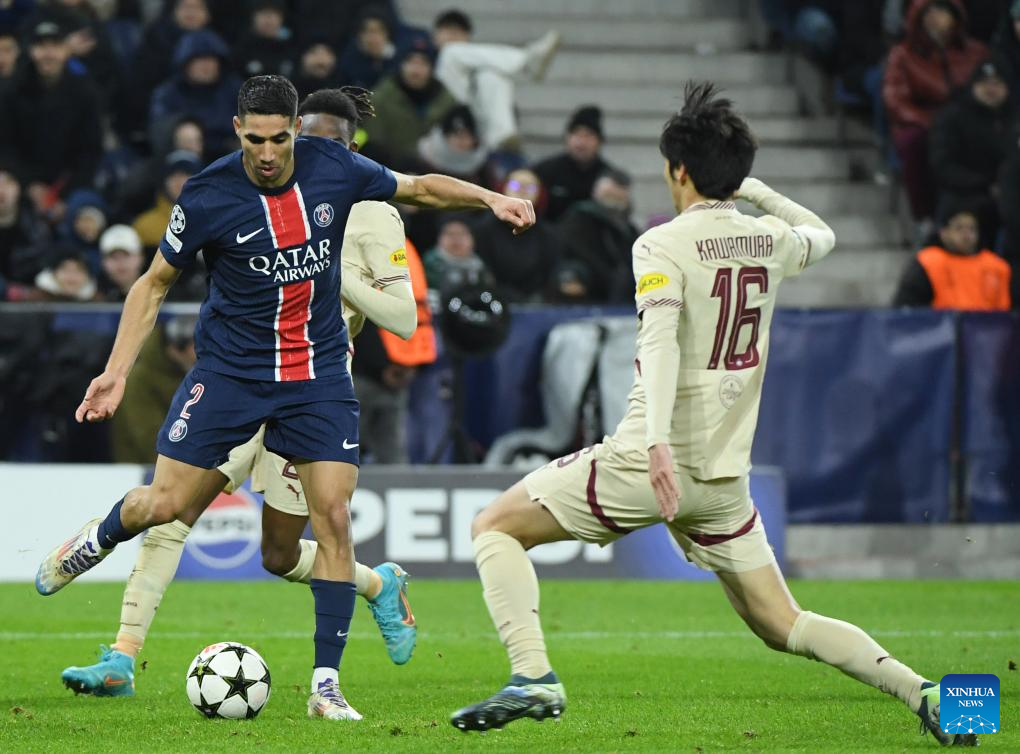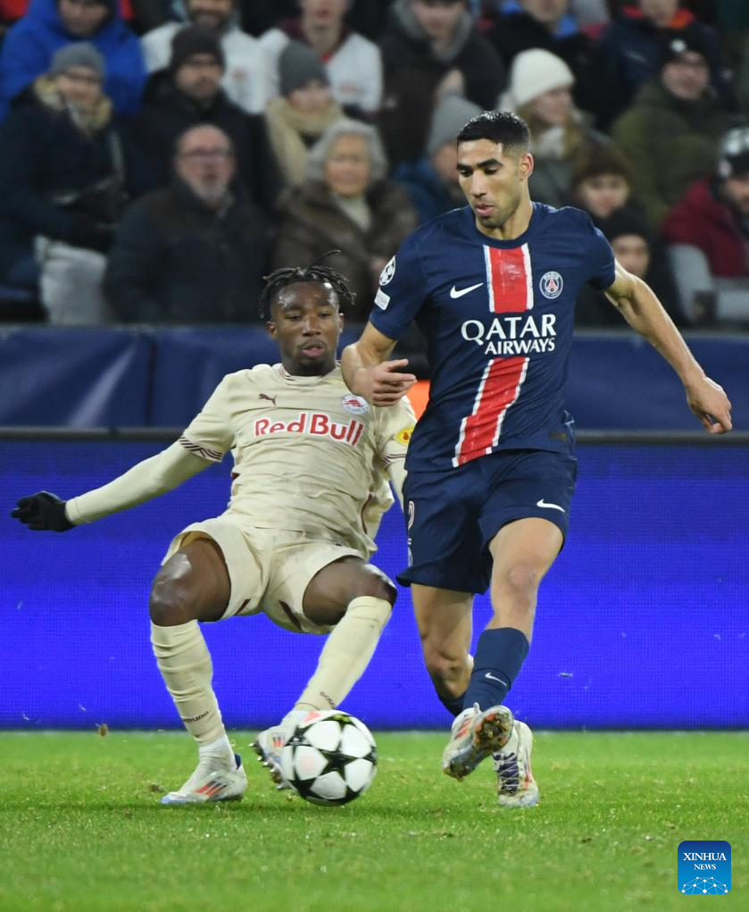 Hakimi Achraf (R) of Paris Saint-Germain passes the ball during the UEFA Champions League match between FC Salzburg and Paris Saint-Germain in Salzburg, Austria, Dec. 10, 2024. (Xinhua/He Canling)