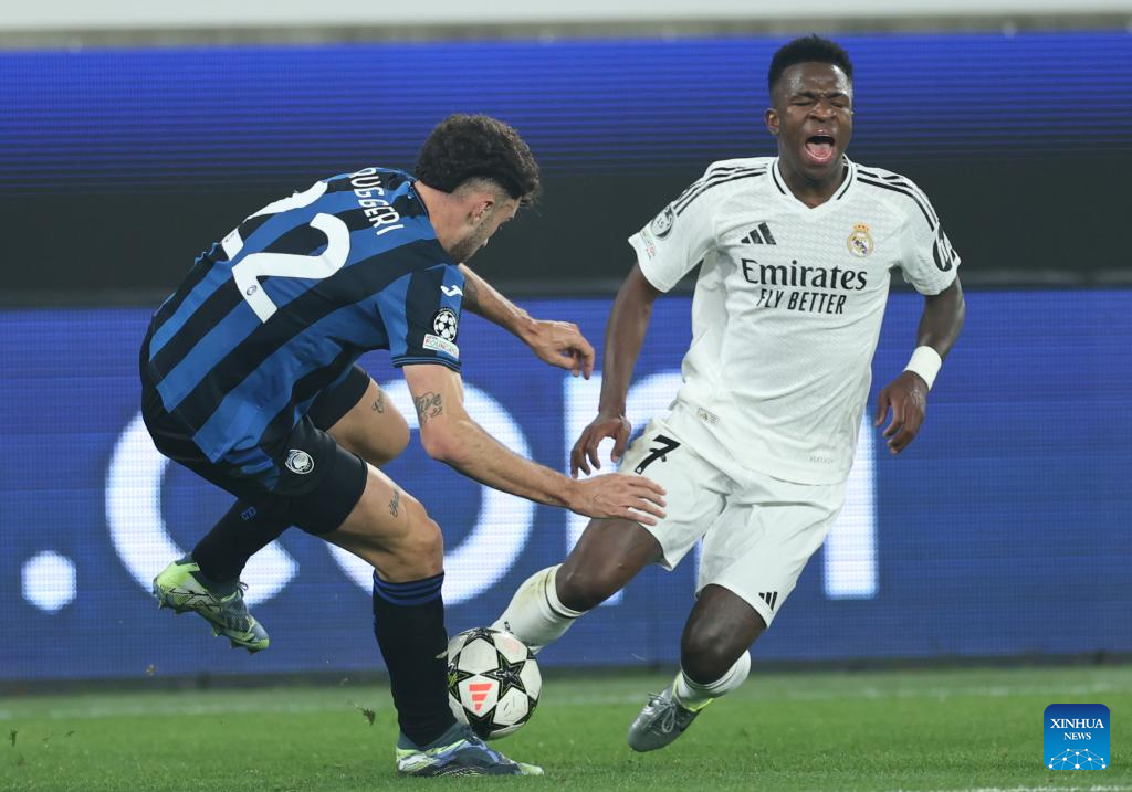 Real Madrid's Vinicius Junior (R) vies with Atalanta's Matteo Ruggeri during the UEFA Champions League match between Atalanta and Real Madrid in Bergamo, Italy, Dec. 10, 2024. (Xinhua/Li Jing)
