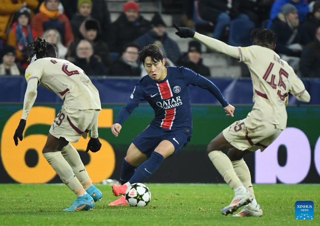 Lee Kang-in (C) of Paris Saint-Germain competes during the UEFA Champions League match between FC Salzburg and Paris Saint-Germain in Salzburg, Austria, Dec. 10, 2024. (Xinhua/He Canling)