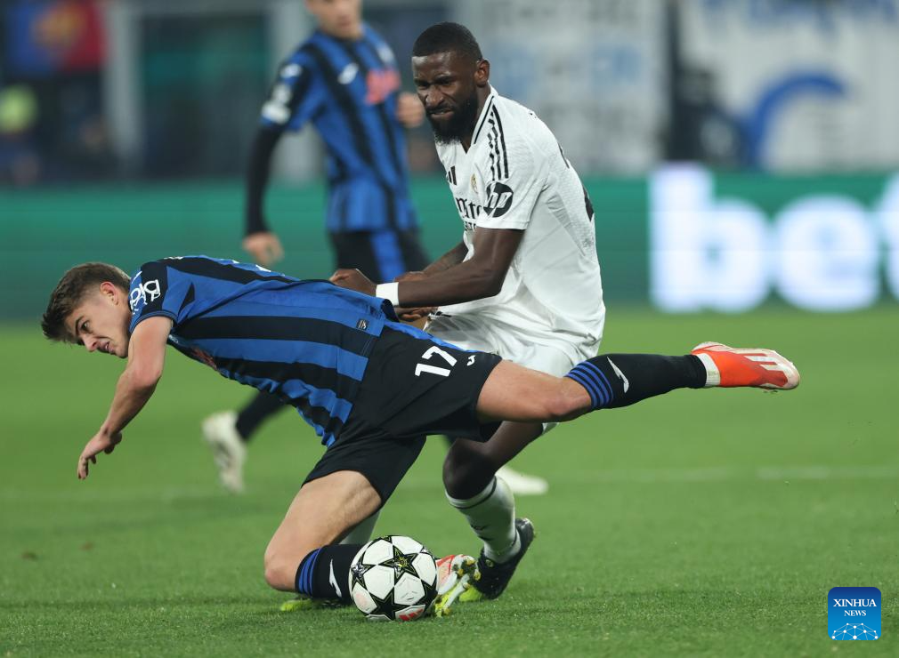 Atalanta's Charles De Ketelaere (L) vies with Real Madrid's Antonio Rudiger during the UEFA Champions League match between Atalanta and Real Madrid in Bergamo, Italy, Dec. 10, 2024. (Xinhua/Li Jing)