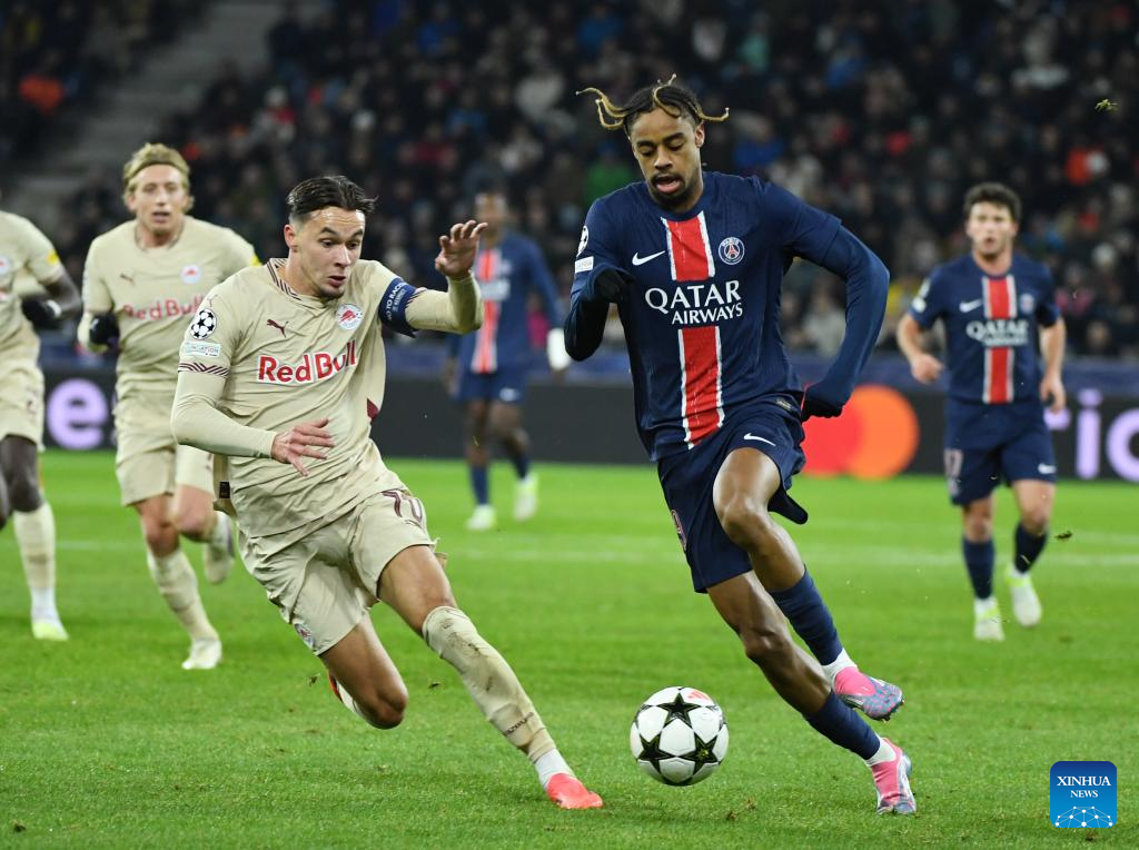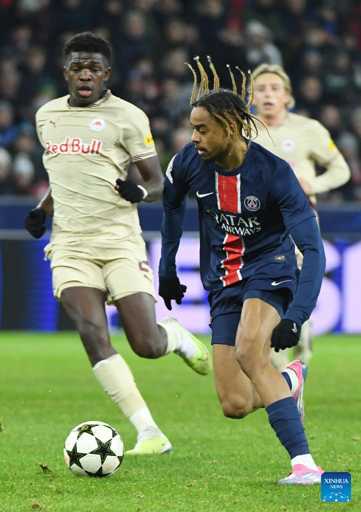 Bradley Barcola (R) of Paris Saint-Germain passes the ball during the UEFA Champions League match between FC Salzburg and Paris Saint-Germain in Salzburg, Austria, Dec. 10, 2024. (Xinhua/He Canling)