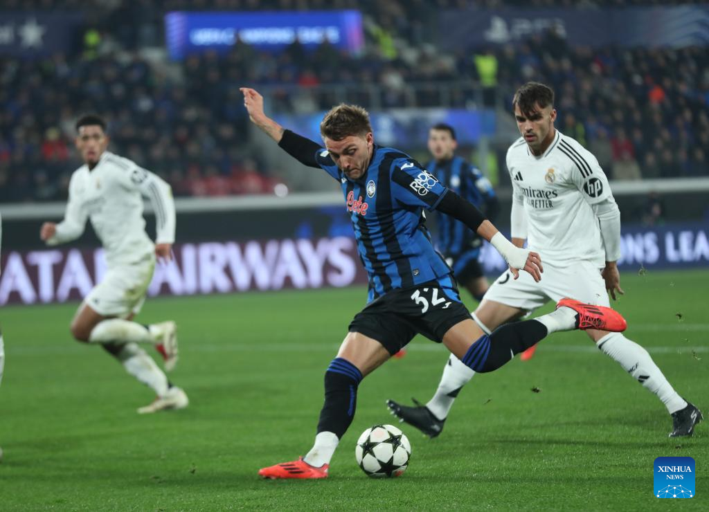 Atalanta's Mateo Retegui (C) competes during the UEFA Champions League match between Atalanta and Real Madrid in Bergamo, Italy, Dec. 10, 2024. (Xinhua/Li Jing)