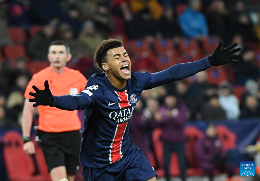 Desire Doue of Paris Saint-Germain celebrates scoring during the UEFA Champions League match between FC Salzburg and Paris Saint-Germain in Salzburg, Austria, Dec. 10, 2024. (Xinhua/He Canling)