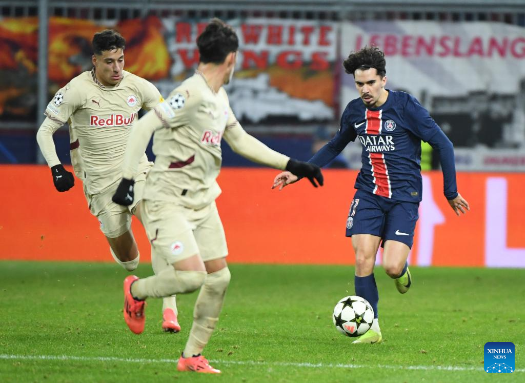 Vitinha (R) of Paris Saint-Germain competes during the UEFA Champions League match between FC Salzburg and Paris Saint-Germain in Salzburg, Austria, Dec. 10, 2024. (Xinhua/He Canling)