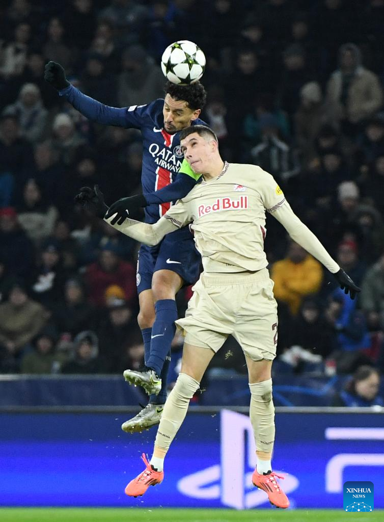 Marquinhos (L) of Paris Saint-Germain vies with Petar Ratkov of FC Salzburg during the UEFA Champions League match between FC Salzburg and Paris Saint-Germain in Salzburg, Austria, Dec. 10, 2024. (Xinhua/He Canling)