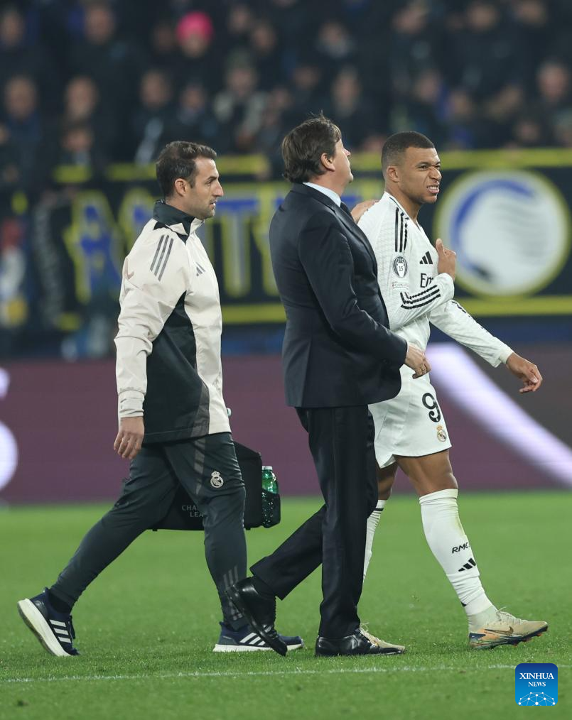 Real Madrid's Kylian Mbappe (R) is substituted off due to injury during the UEFA Champions League match between Atalanta and Real Madrid in Bergamo, Italy, Dec. 10, 2024. (Xinhua/Li Jing)