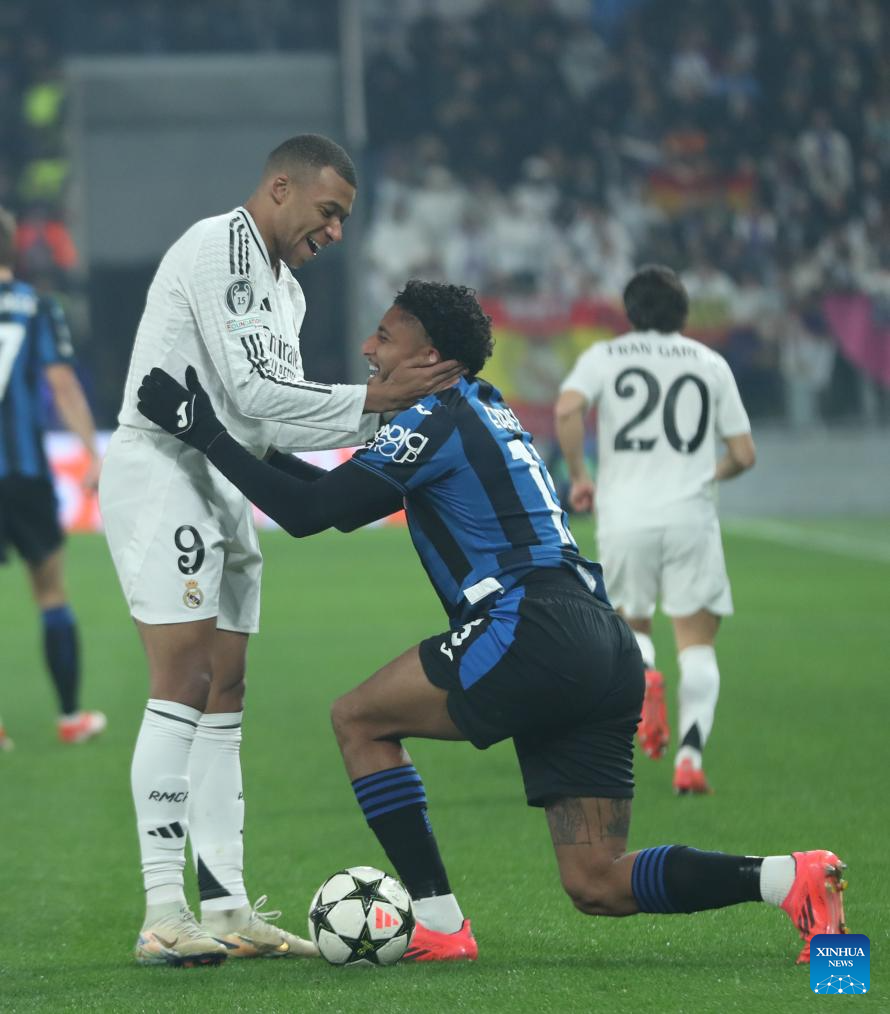 Real Madrid's Kylian Mbappe (L) talks with Atalanta's Ederson during the UEFA Champions League match between Atalanta and Real Madrid in Bergamo, Italy, Dec. 10, 2024. (Xinhua/Li Jing)