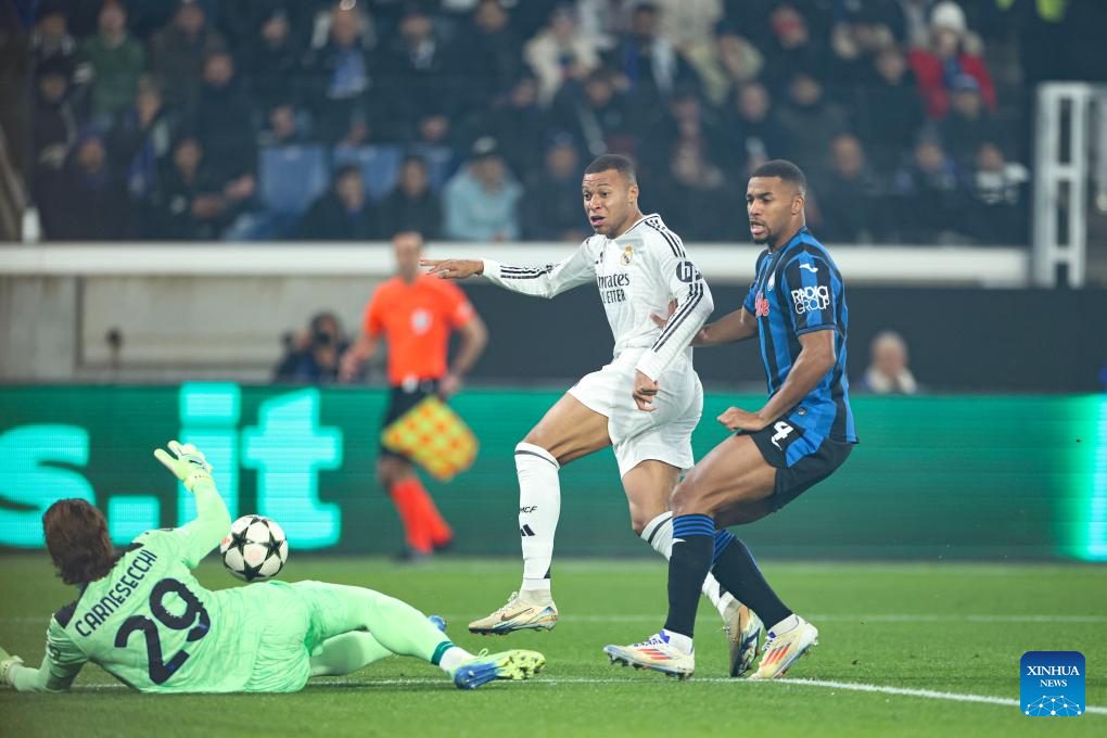 Real Madrid's Kylian Mbappe (2nd R) shoots to score during the UEFA Champions League match between Atalanta and Real Madrid in Bergamo, Italy, Dec. 10, 2024. (Xinhua/Li Jing)