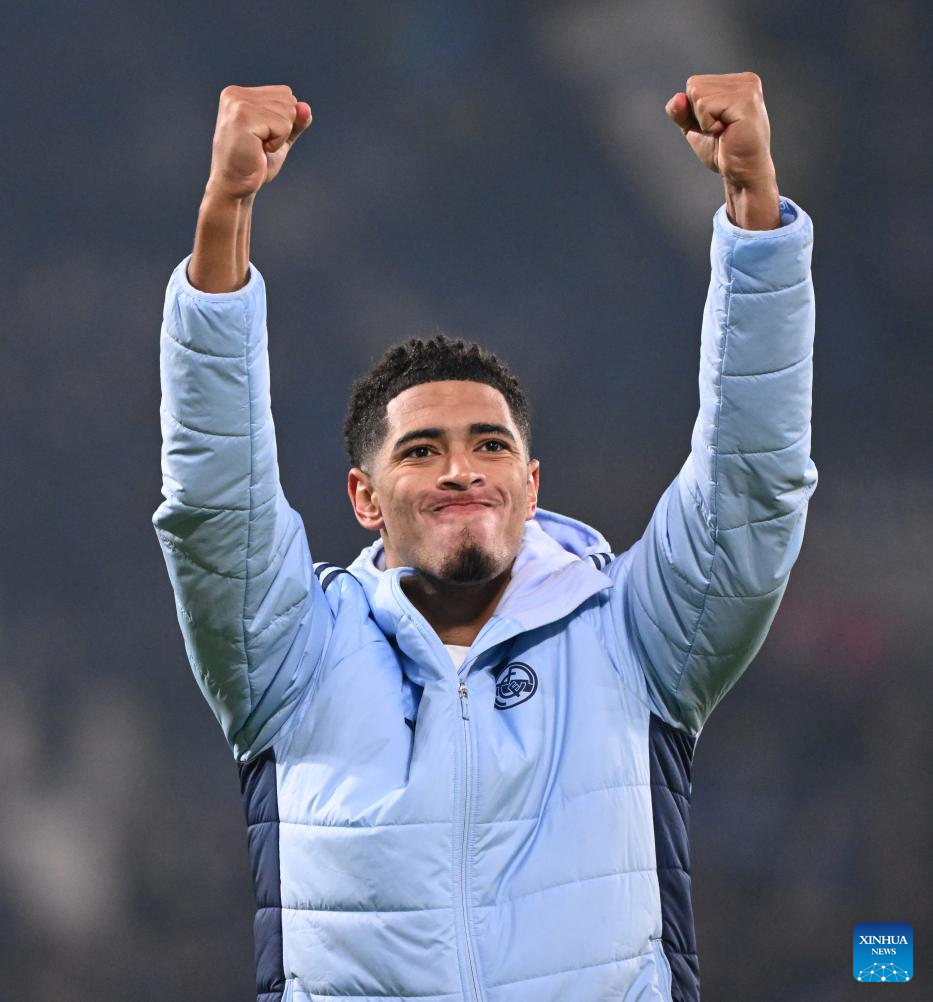 Real Madrid's Jude Bellingham celebrates after the UEFA Champions League match between Atalanta and Real Madrid in Bergamo, Italy, Dec. 10, 2024. (Photo by Alberto Lingria/Xinhua)