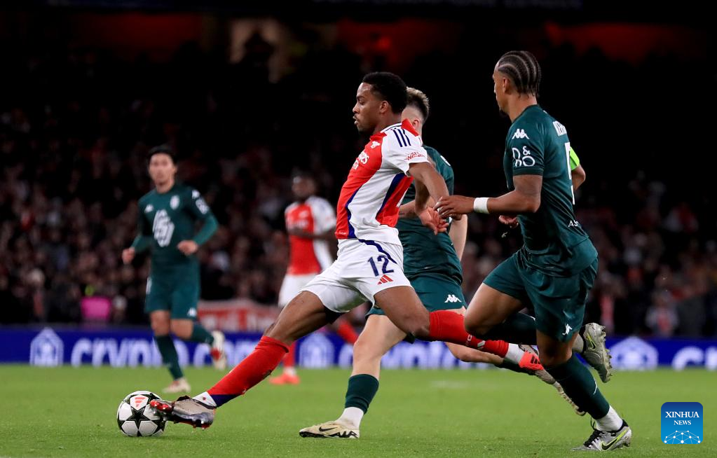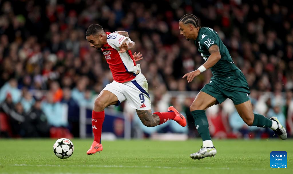 Gabriel Jesus (L) of Arsenal breaks through during the UEFA Champions League football match between Arsenal and Monaco in London, Britain, on Dec. 11, 2024. (Xinhua/Li Ying)