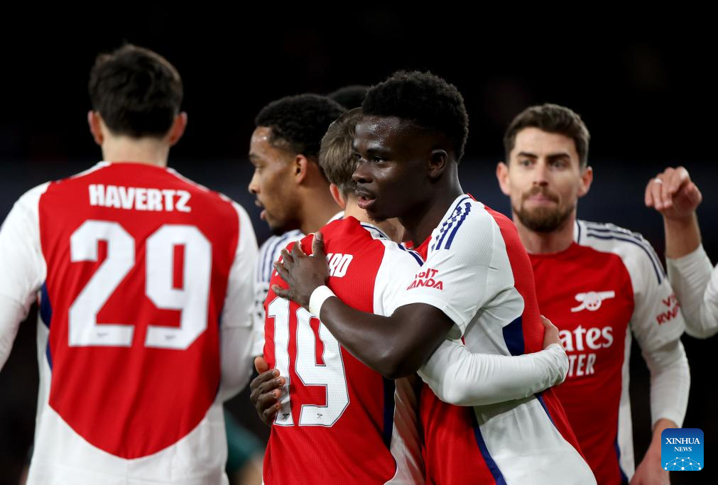 Bukayo Saka (2nd R) of Arsenal celebrates after scoring his second goal during the UEFA Champions League football match between Arsenal and Monaco in London, Britain, on Dec. 11, 2024. (Xinhua/Li Ying)