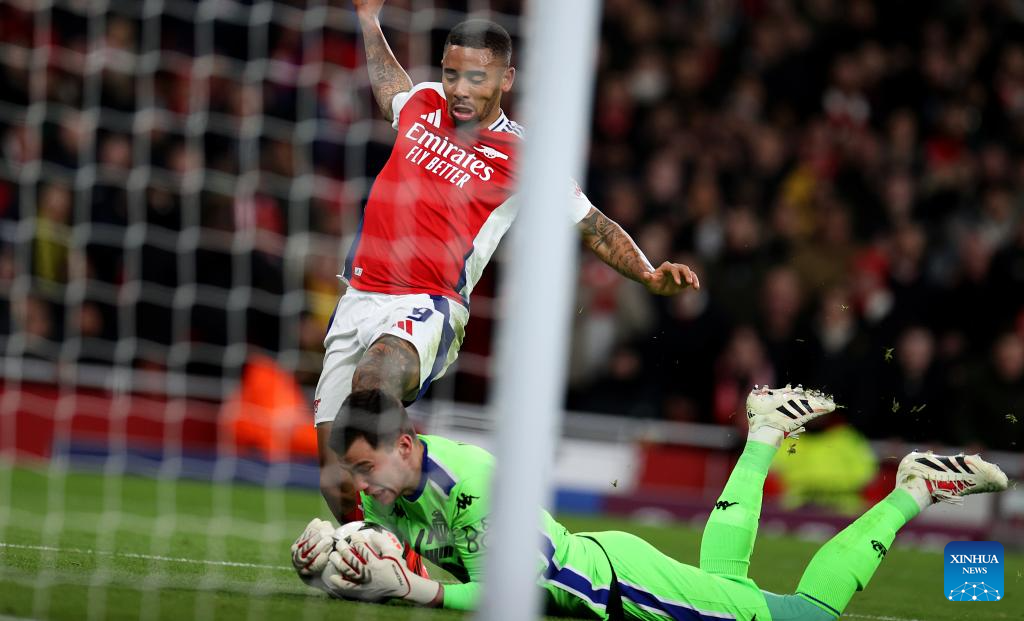 Monaco's goalkeeper Radoslaw Majecki (below) vies with Arsenal's Gabriel Jesus during the UEFA Champions League football match between Arsenal and Monaco in London, Britain, on Dec. 11, 2024. (Xinhua/Li Ying)