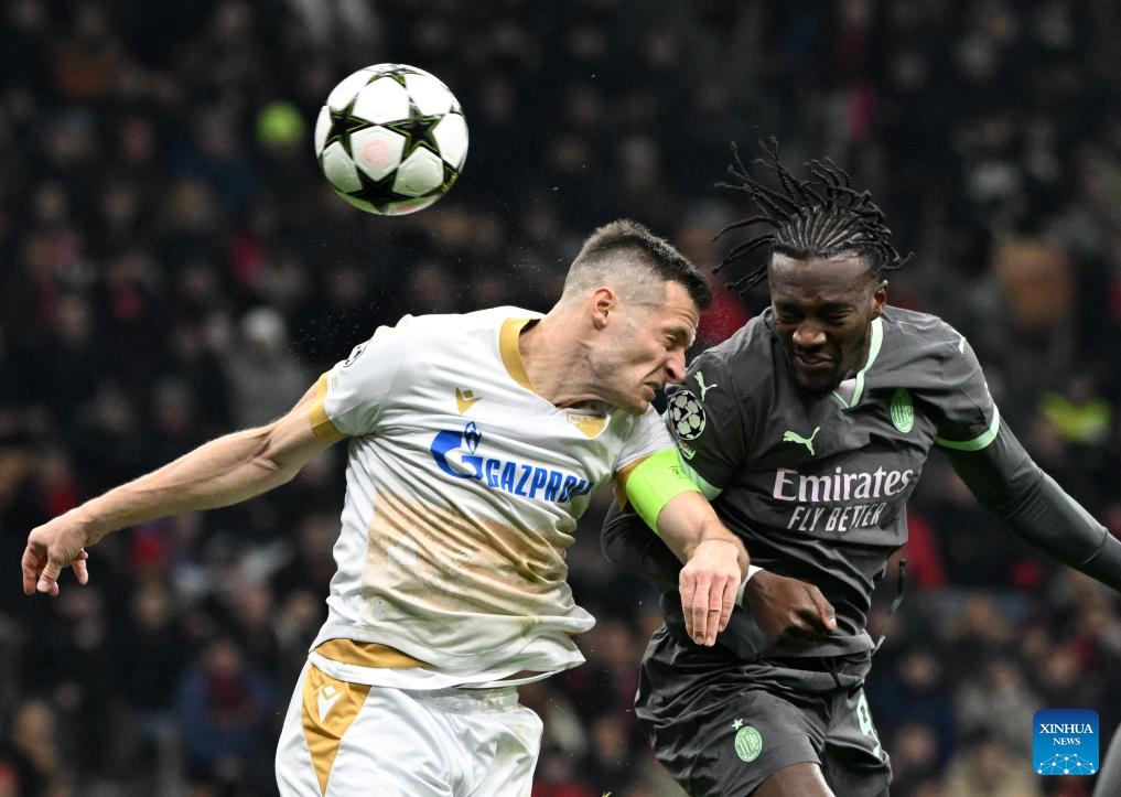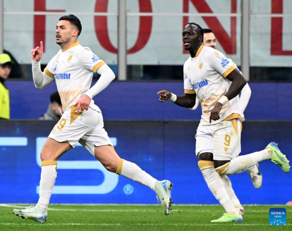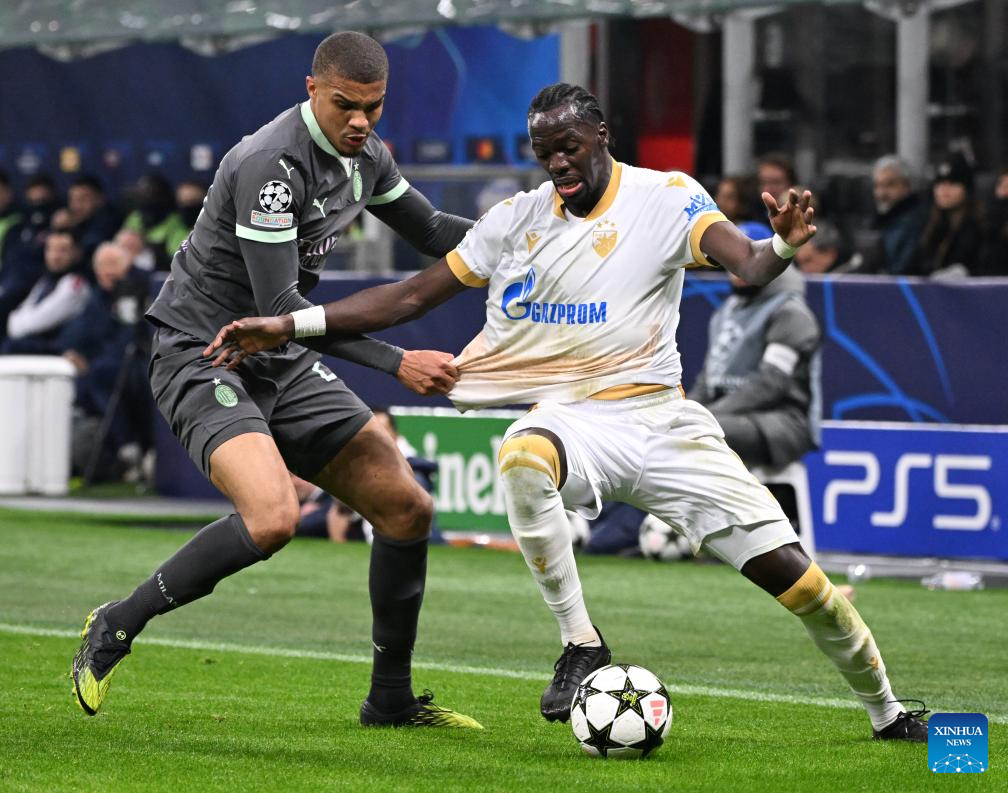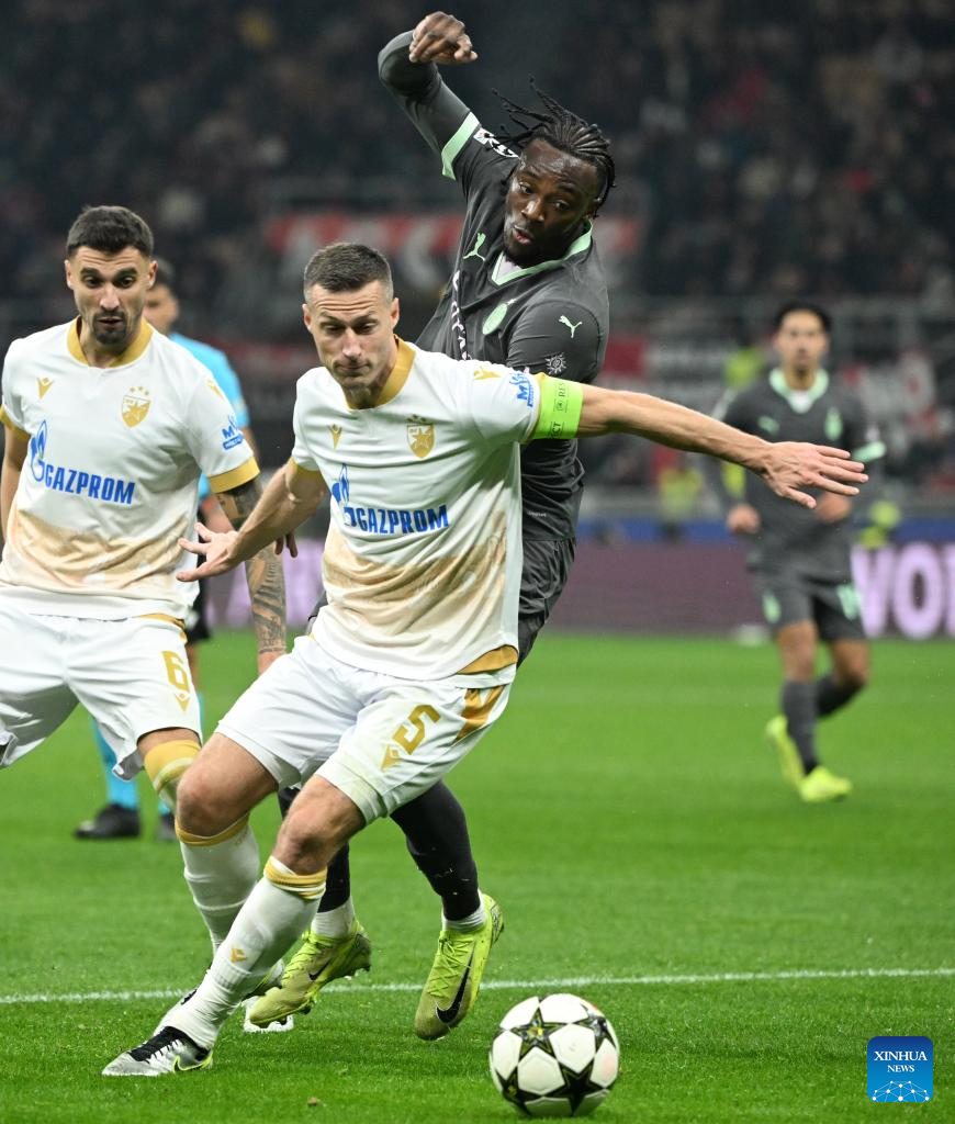 Crvena Zvezda's Nemanja Radonjic (L) celebrates his goal during the UEFA Champions League match between AC Milan and Crvena Zvezda in Milan, Italy, Dec. 11, 2024. (Photo by Alberto Lingria/Xinhua)
