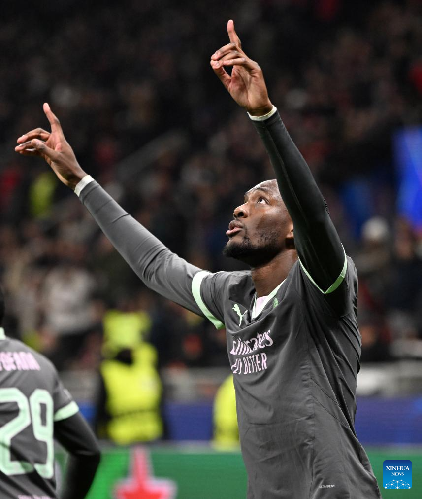 AC Milan's Tammy Abraham celebrates his goal during the UEFA Champions League match between AC Milan and Crvena Zvezda in Milan, Italy, Dec. 11, 2024. (Photo by Alberto Lingria/Xinhua)