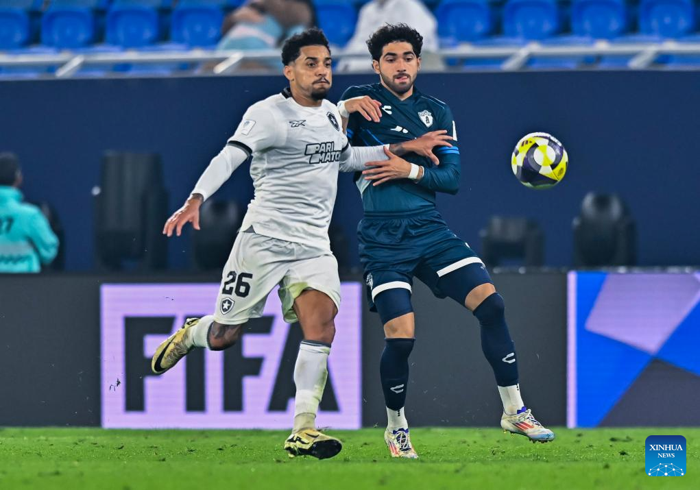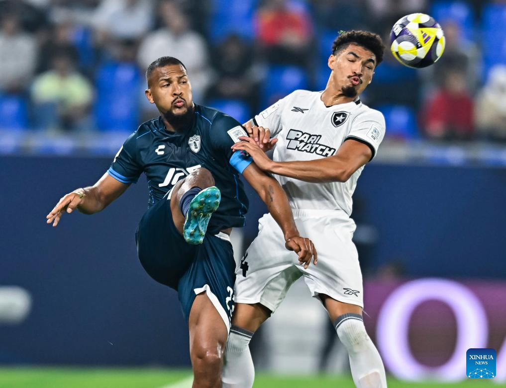 Salomon Rondon (L) of CF Pachuca vies with Adryelson of Botafogo during the FIFA Intercontinental Cup match between Brazil's Botafogo and Mexico's CF Pachuca in Doha, Qatar on Dec. 11, 2024. (Photo by Nikku/Xinhua)