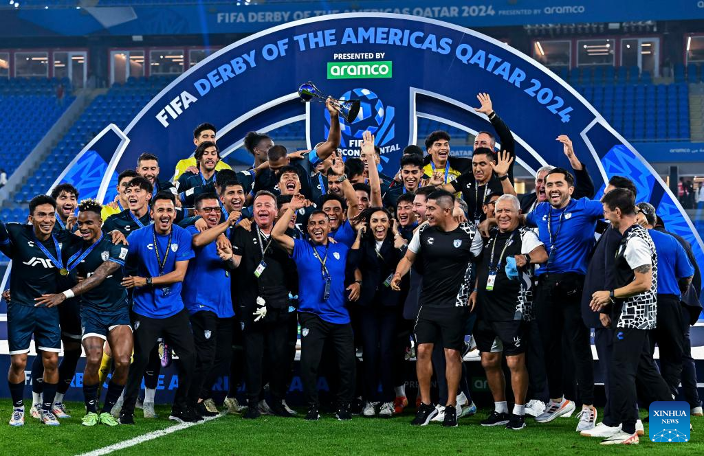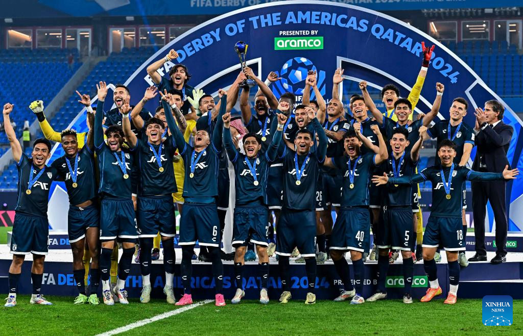 Players of CF Pachuca celebrate with the trophy after winning the FIFA Intercontinental Cup match between Brazil's Botafogo and Mexico's CF Pachuca in Doha, Qatar on Dec. 11, 2024. (Photo by Nikku/Xinhua)