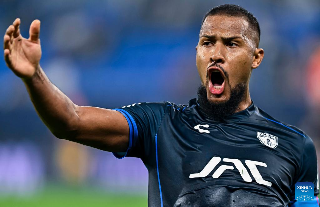 Salomon Rondon of CF Pachuca celebrates after scoring during the FIFA Intercontinental Cup match between Brazil's Botafogo and Mexico's CF Pachuca in Doha, Qatar on Dec. 11, 2024. (Photo by Nikku/Xinhua)
