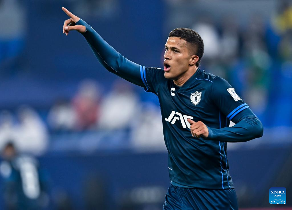 Nelson Deossa of CF Pachuca celebrates after scoring during the FIFA Intercontinental Cup match between Brazil's Botafogo and Mexico's CF Pachuca in Doha, Qatar on Dec. 11, 2024. (Photo by Nikku/Xinhua)