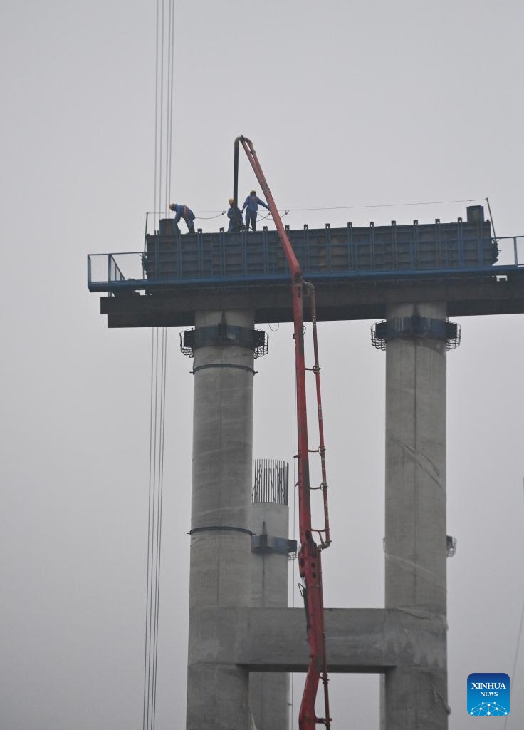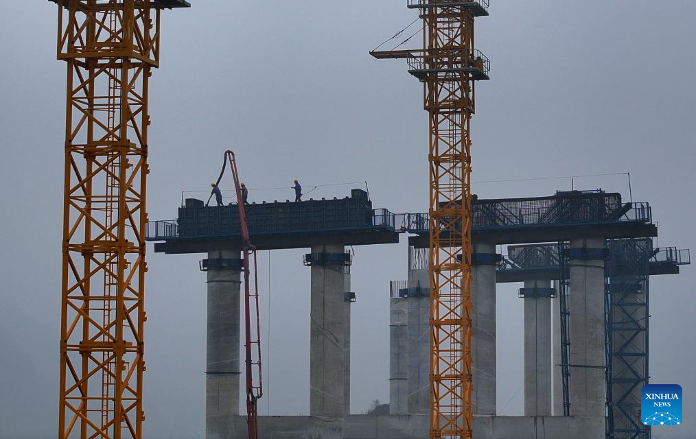 People work at the construction site of an expressway linking Yufeng and Yizhou in south China's Guangxi Zhuang Autonomous Region, Dec. 11, 2024. (Xinhua/Huang Xiaobang)