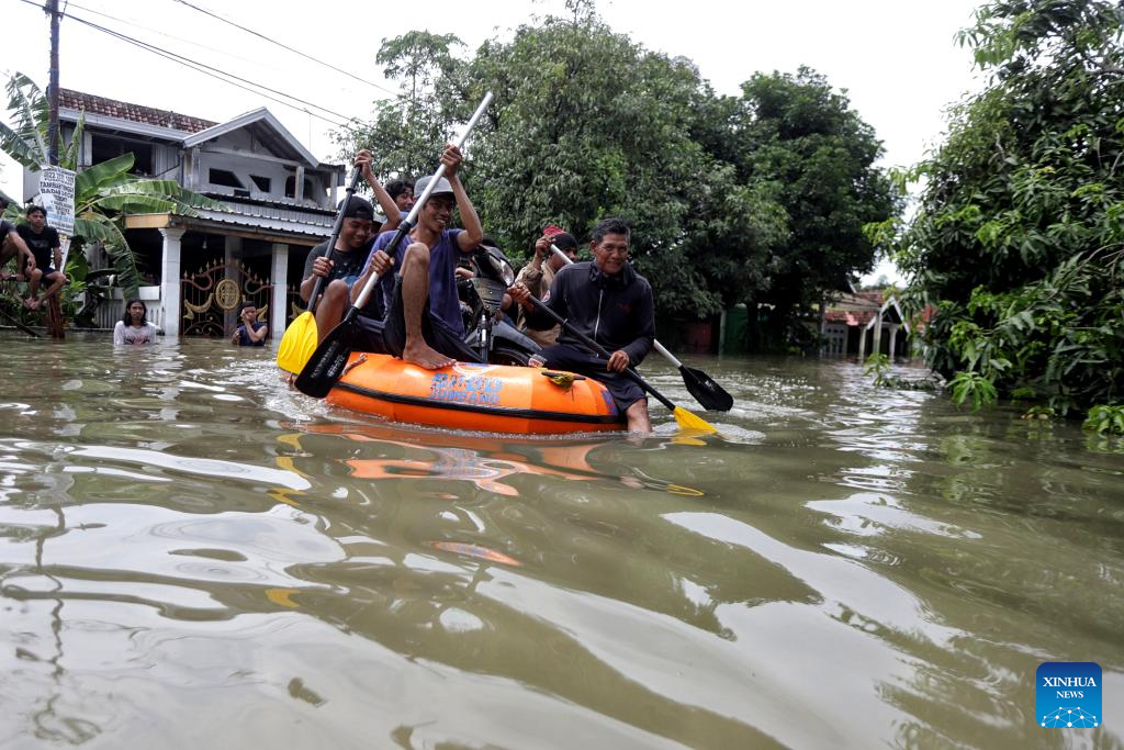 People ride a rubber boat in flood water in Jombang, East Java, Indonesia, on Dec. 12, 2024. (Photo by Saddam/Xinhua)