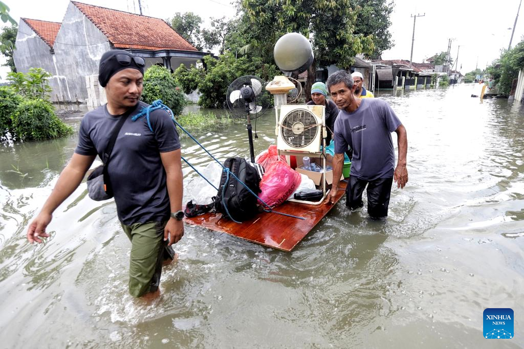 People wade through flood water with their belongings in Jombang, East Java, Indonesia, on Dec. 12, 2024. (Photo by Saddam/Xinhua)