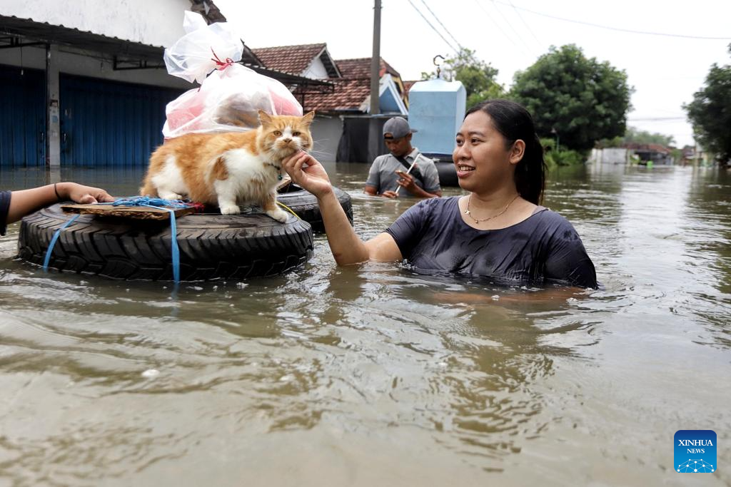 A woman touches her cat as they wade through flood water in Jombang, East Java, Indonesia, on Dec. 12, 2024. (Photo by Saddam/Xinhua)