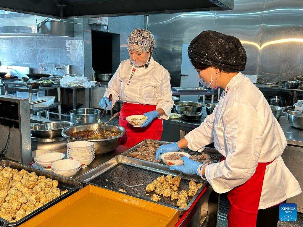 YINCHUAN, Dec. 12 (Xinhua) -- As noon approaches, Ma Fang, the owner of a wedding banquet hall in Tongxin County in the city of Wuzhong, northwest China's Ningxia Hui Autonomous Region, is busy preparing a bowl of local traditional soup, adding sliced green radish, tofu, wood ear mushrooms and rice noodles.