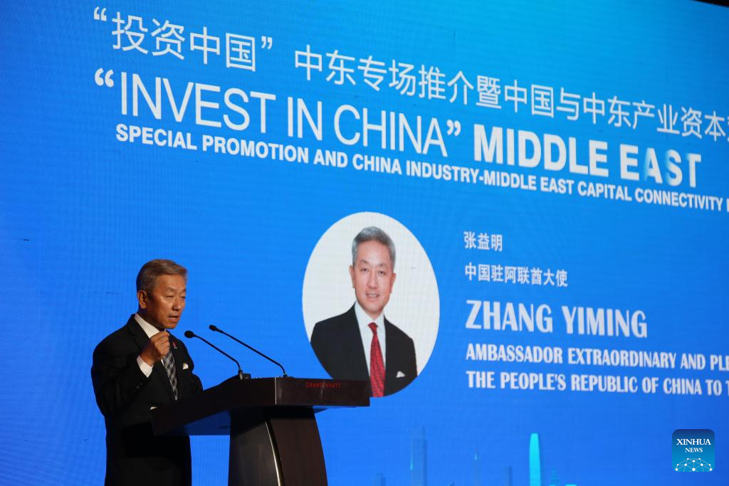 Chinese Ambassador to the United Arab Emirates Zhang Yiming speaks at the "Invest in China" Middle East promotional event in Abu Dhabi, the United Arab Emirates, Dec. 11, 2024. The "Invest in China" Middle East Special Promotion and China Industry-Middle East Capital Connectivity Event concluded here on Thursday.