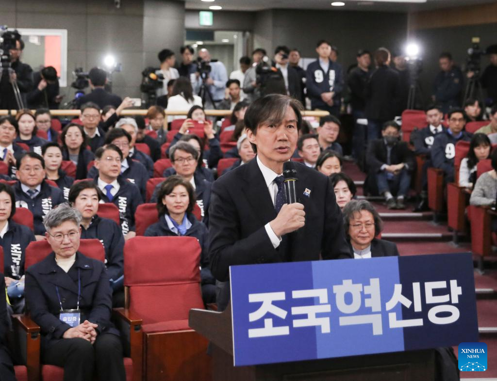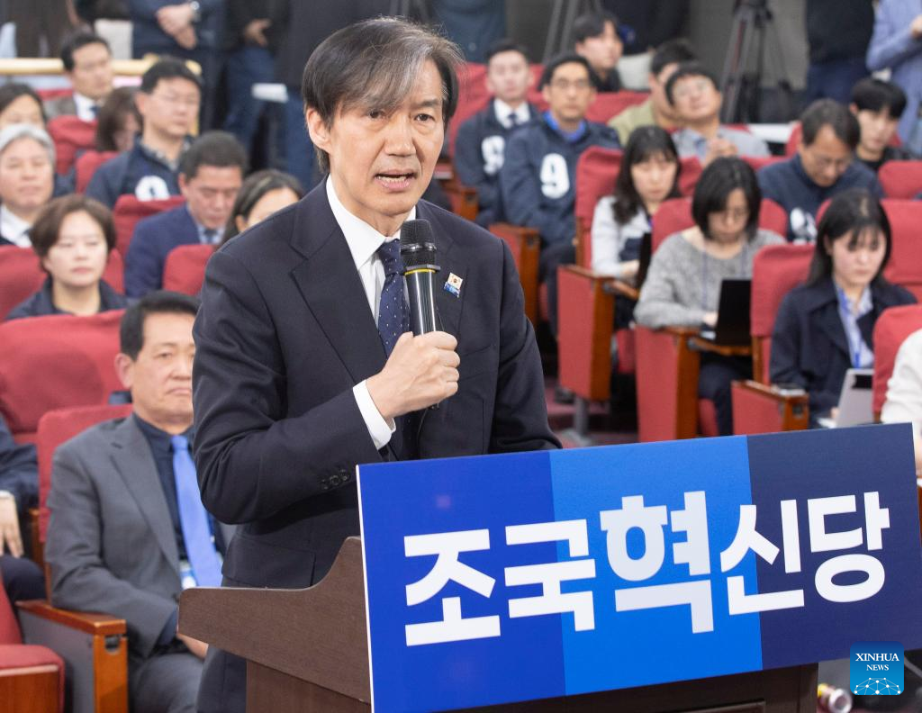 This file photo taken on April 10, 2024 shows Cho Kuk delivering a speech at the parliament in South Korea. South Korea's Supreme Court on Thursday sentenced former Justice Minister Cho Kuk, leader of the minor opposition Innovation Party, to two years in prison. (Xinhua/Yao Qilin)