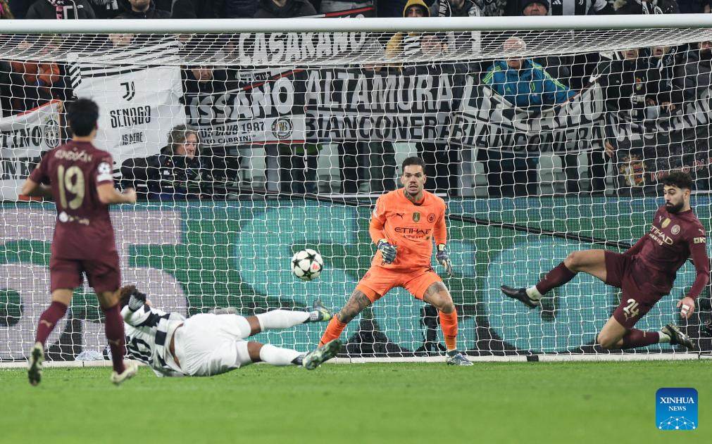 Juventus' Weston McKennie (2nd L) scores during the UEFA Champions League match between Juventus and Manchester City in Turin, Italy, Dec. 11, 2024. (Xinhua/Li Jing)