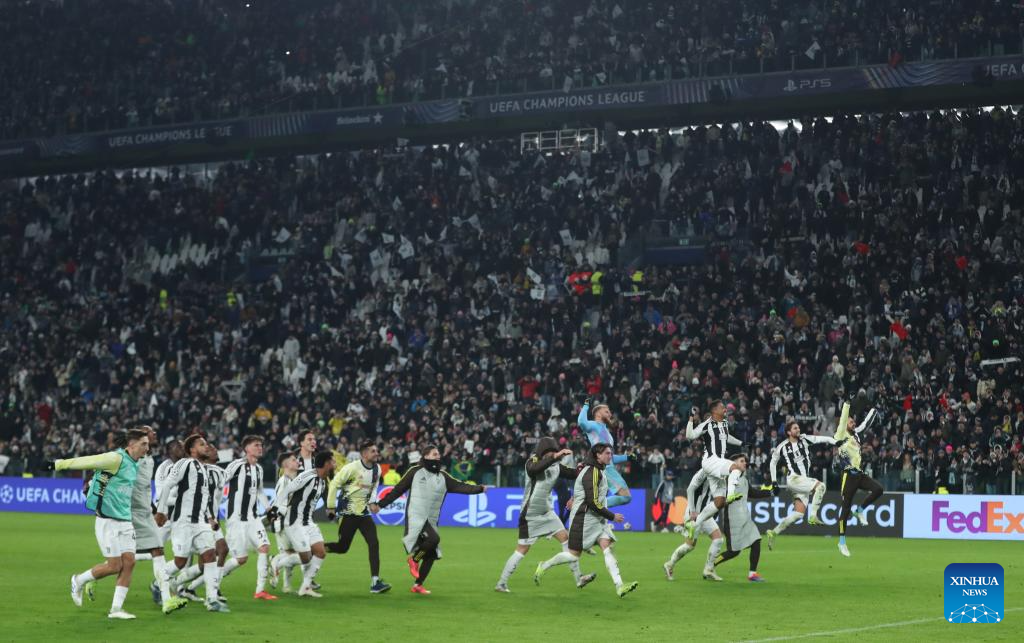 Players of Juventus celebrate after the UEFA Champions League match between Juventus and Manchester City in Turin, Italy, Dec. 11, 2024. (Xinhua/Li Jing)