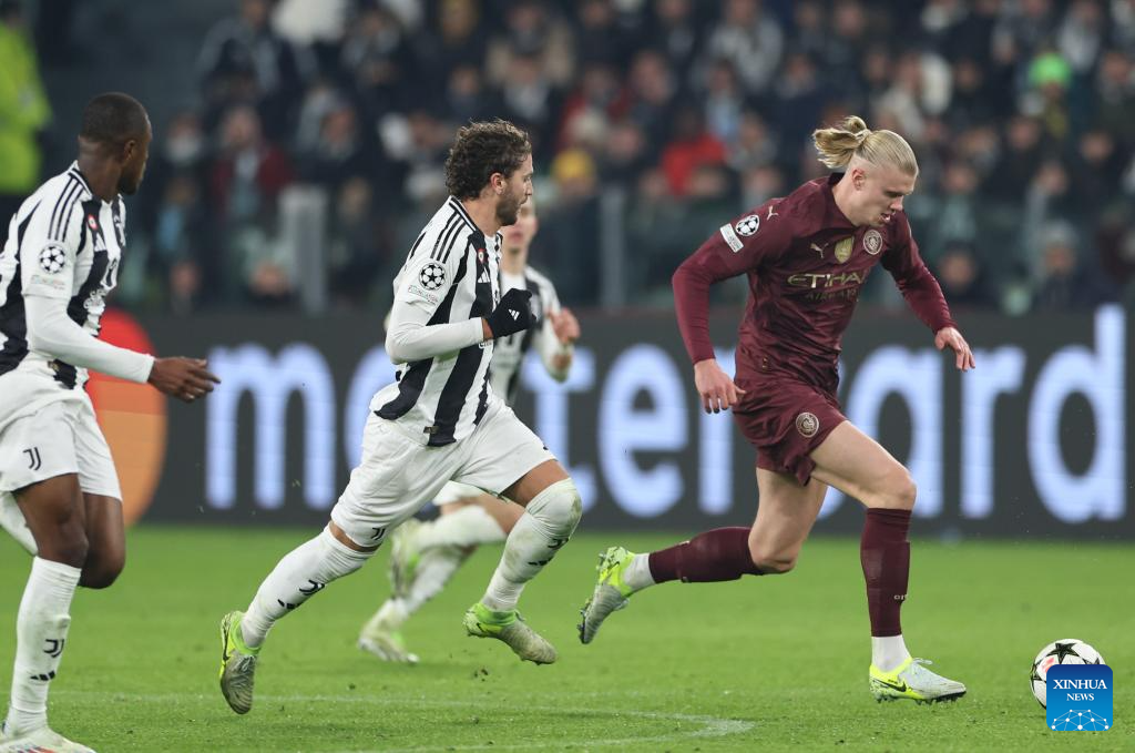 Manchester City's Erling Haaland (1st R) breaks through during the UEFA Champions League match between Juventus and Manchester City in Turin, Italy, Dec. 11, 2024. (Xinhua/Li Jing)