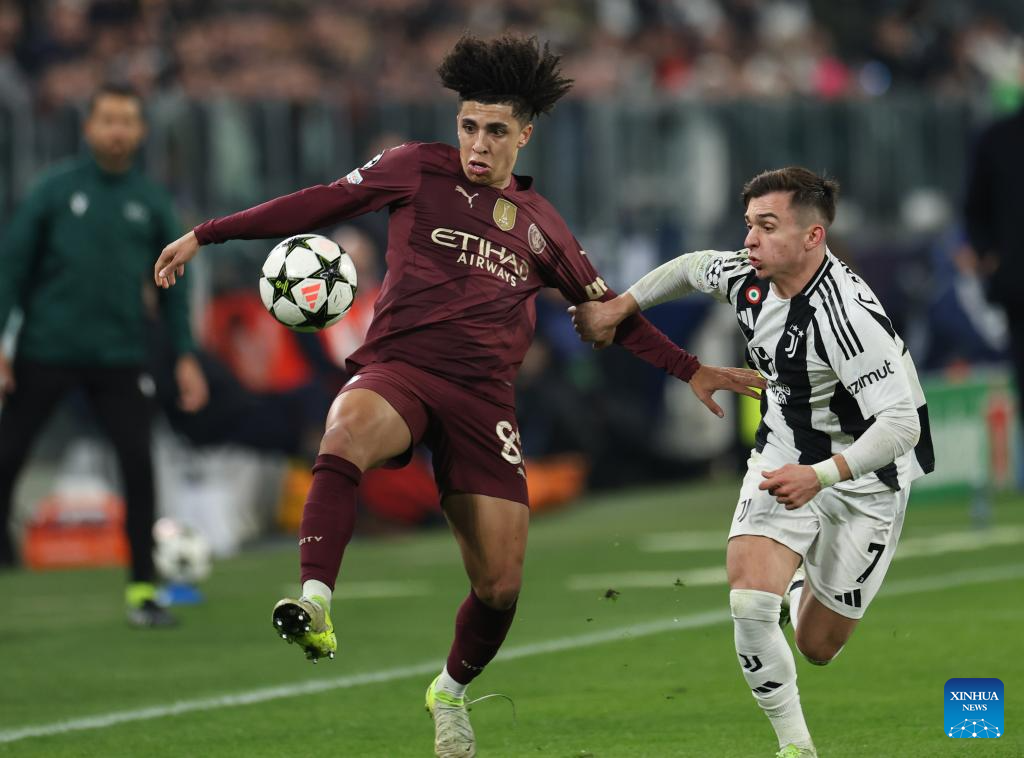 Manchester City's Rico Lewis (L) vies with Juventus' Francisco Conceicao during the UEFA Champions League match between Juventus and Manchester City in Turin, Italy, Dec. 11, 2024. (Xinhua/Li Jing)