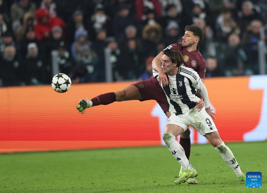 Juventus' Dusan Vlahovic (below) vies with Manchester City's Ruben Dias during the UEFA Champions League match between Juventus and Manchester City in Turin, Italy, Dec. 11, 2024. (Xinhua/Li Jing)