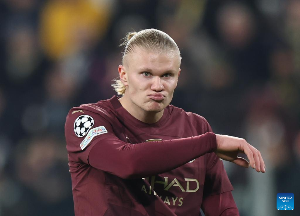 Manchester City's Erling Haaland reacts during the UEFA Champions League match between Juventus and Manchester City in Turin, Italy, Dec. 11, 2024. (Xinhua/Li Jing)