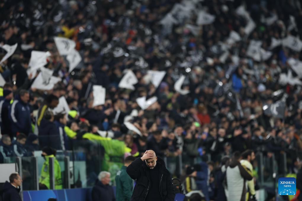 Manchester City's head coach Pep Guardiola reacts during the UEFA Champions League match between Juventus and Manchester City in Turin, Italy, Dec. 11, 2024. (Xinhua/Li Jing)