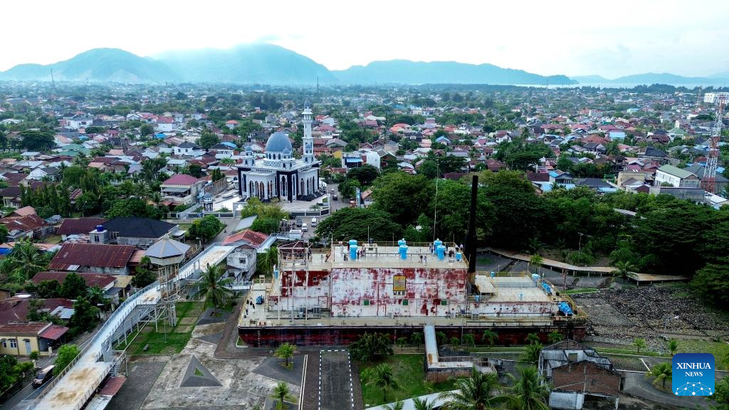 An aerial drone photo taken on Dec. 12, 2024 shows people visiting PLTD Apung 1, former electric generator barge, stranded on dry land as memorial site of tsunami in Banda Aceh, Aceh Province, Indonesia.