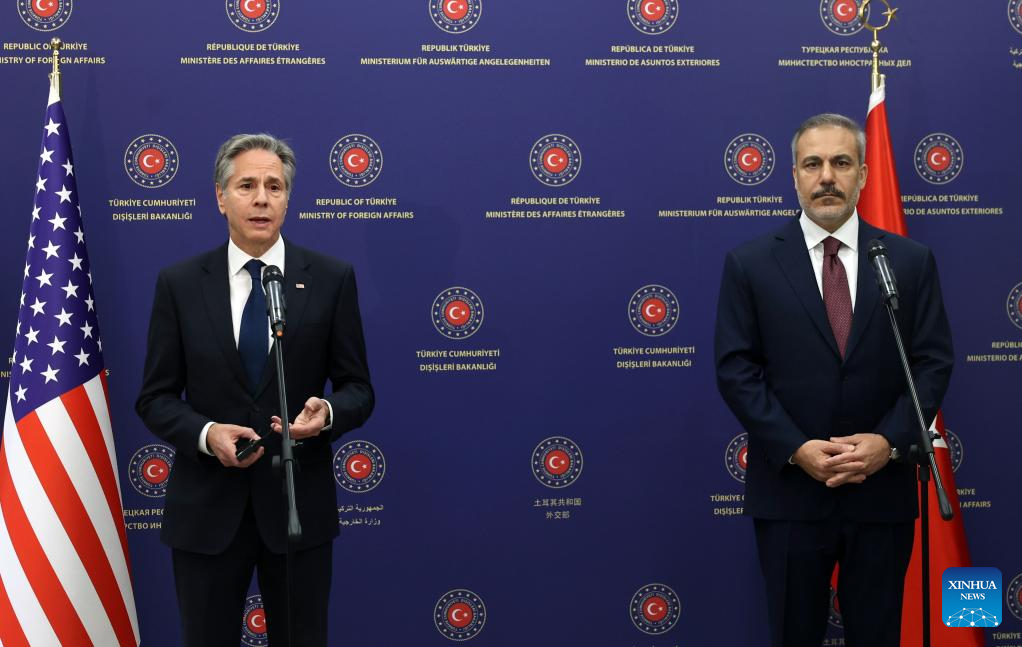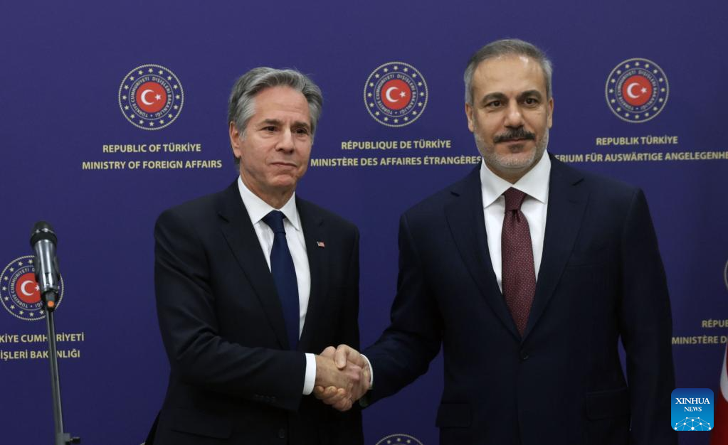 ANKARA, Dec. 13 (Xinhua) -- Turkish Foreign Minister Hakan Fidan and U.S. Secretary of State Antony Blinken held a meeting Friday on combating terrorism and achieving stability in Syria, calling for an immediate ceasefire in Gaza.