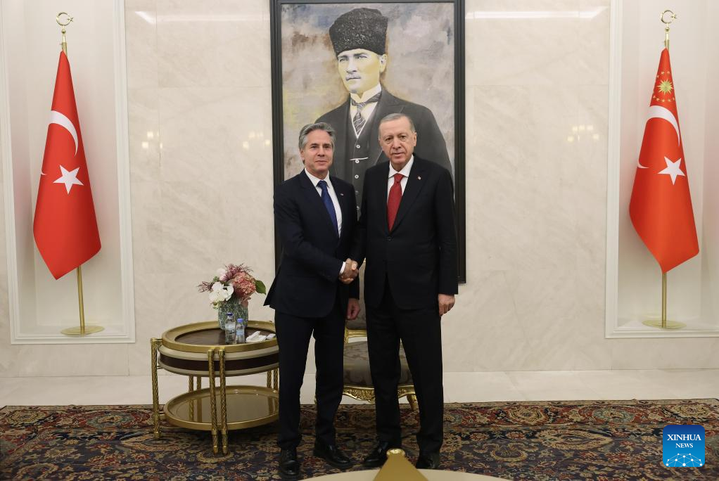Turkish President Recep Tayyip Erdogan (R) holds a meeting with visiting U.S. Secretary of State Antony Blinken in Ankara, Türkiye, Dec. 12, 2024. Blinken arrived in the Turkish capital on Thursday. Upon his arrival, Erdogan held a meeting with him on the situation in Syria. (Mustafa Kaya/Handout via Xinhua)