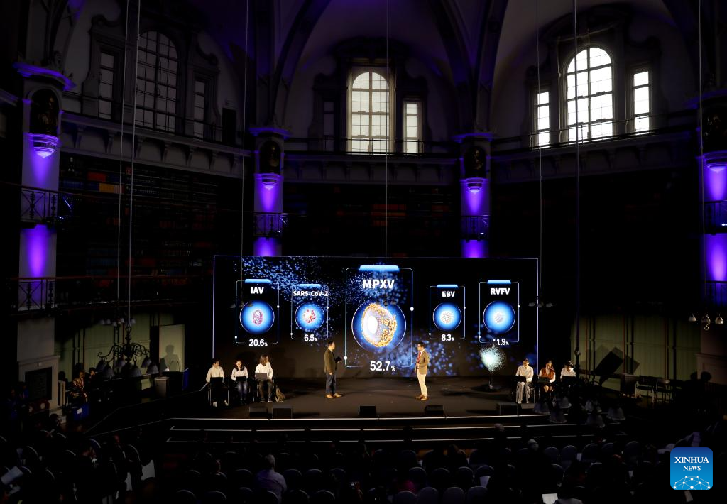 People participate in a demonstration of smart education showcasing a scenario of a future computational biology class using AI, digital twin and virtual reality (VR) technologies, during an international conference on online education and massive open online courses (MOOC) in London, Britain, on Dec. 12, 2024. An international conference on online education and massive open online courses (MOOC) opened in London on Thursday, drawing hundreds of educational professionals from across the globe to discuss the transformative potential of online learning and artificial intelligence (AI) in shaping the future of higher education.