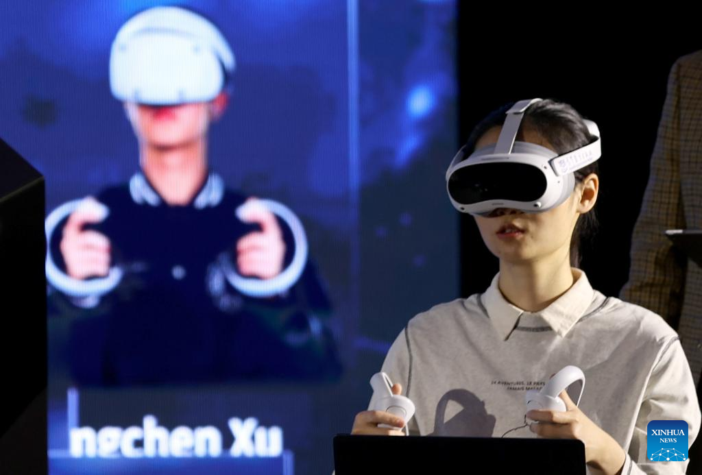 A woman participates in a demonstration of smart education showcasing a scenario of a future computational biology class using AI, digital twin and virtual reality (VR) technologies, during an international conference on online education and massive open online courses (MOOC) in London, Britain, on Dec. 12, 2024. An international conference on online education and massive open online courses (MOOC) opened in London on Thursday, drawing hundreds of educational professionals from across the globe to discuss the transformative potential of online learning and artificial intelligence (AI) in shaping the future of higher education.
