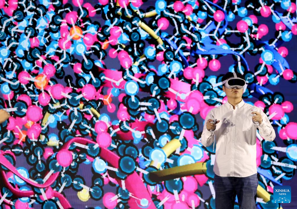A man participates in a demonstration of smart education showcasing a scenario of a future computational biology class using AI, digital twin and virtual reality (VR) technologies, during an international conference on online education and massive open online courses (MOOC) in London, Britain, on Dec. 12, 2024. An international conference on online education and massive open online courses (MOOC) opened in London on Thursday, drawing hundreds of educational professionals from across the globe to discuss the transformative potential of online learning and artificial intelligence (AI) in shaping the future of higher education.