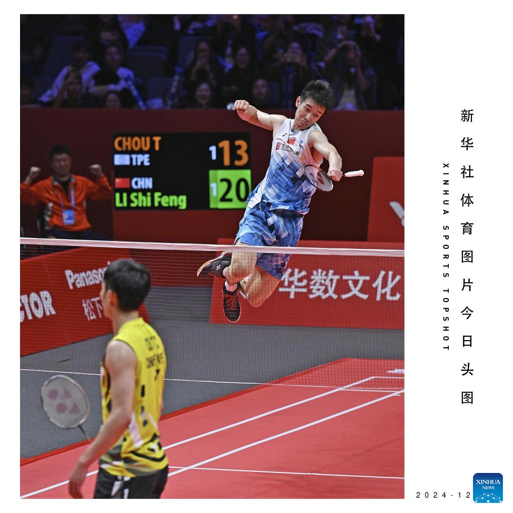 Li Shifeng (R) celebrates victory after the men's singles group A match between Li Shifeng of China and Chou Tien-Chen of Chinese Taipei at BWF World Tour Finals 2024 in Hangzhou, China, Dec. 12, 2024. (Xinhua/Hou Zhaokang)
