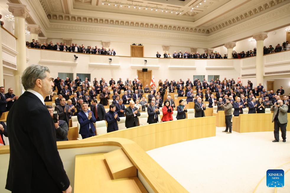 The ruling Georgian Dream party's candidate, Mikheil Kavelashvili (front), is seen after he was elected Georgian president, in Tbilisi, Georgia, Dec. 14, 2024. The ruling Georgian Dream party's candidate, Mikheil Kavelashvili, has been elected Georgian president, the Central Election Commission announced on Saturday. (Georgian Parliament/Handout via Xinhua)