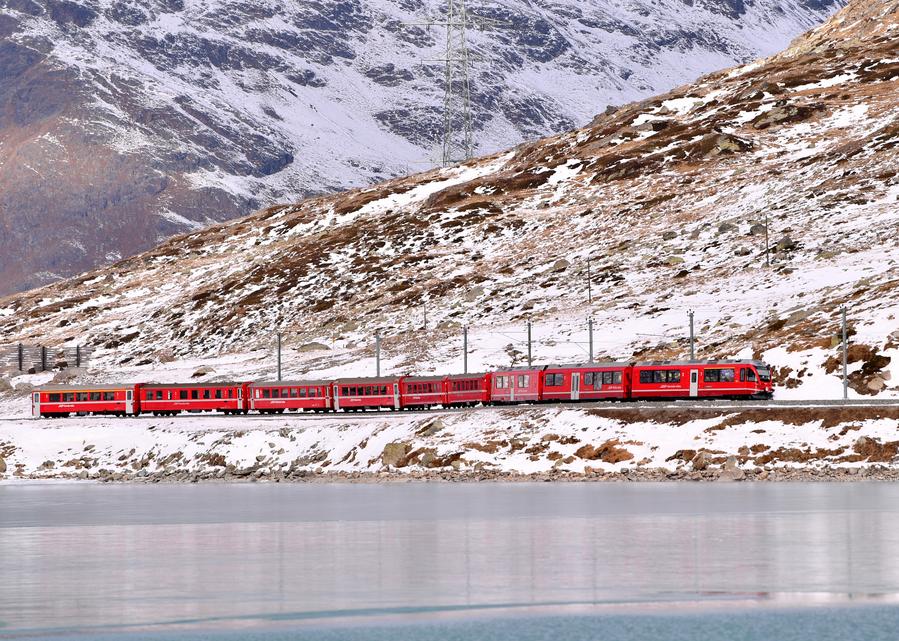 CHUR, Switzerland, Dec. 15 (Xinhua) -- As the Swiss Alps usher in the winter tourism season, commuters and tourists alike aboard the scenic trains passing through Ospizio Bernina, the highest rail-crossing train station in the Alps, are not merely traveling -- they're embarking on a journey through time. As the train glides across century-old stone viaducts, passengers can scan QR codes for audio guides on their hydroelectric-powered ride.