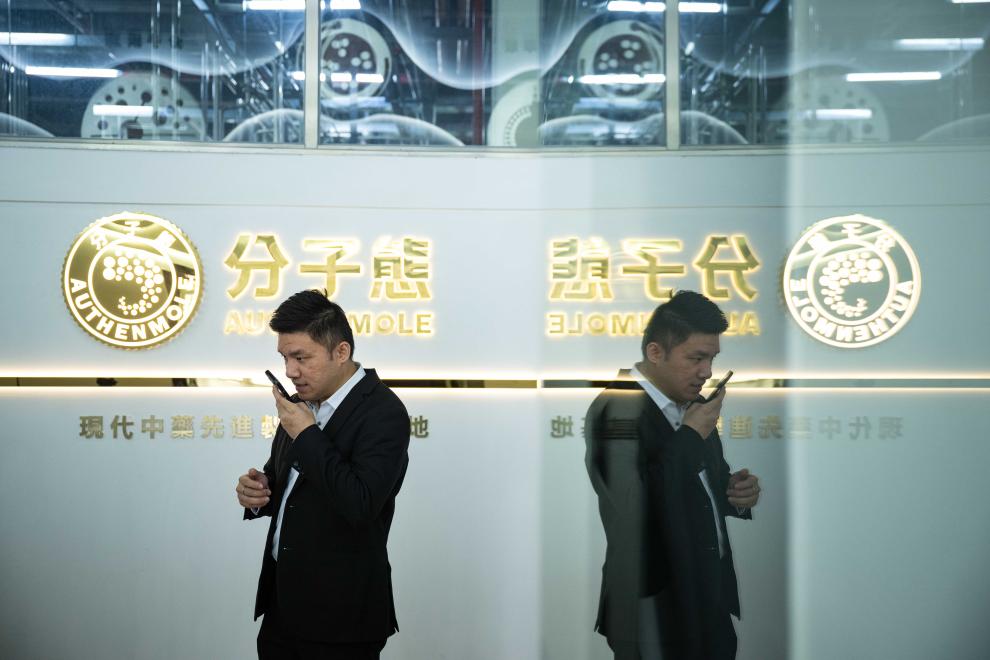 Wong Chi Choi, a young man from Macao, talks to his mobile phone in Authenmole (Hengqin Zhuhai) Traditional Chinese Medicine Health Industry Development Co., Ltd. he works in, in Hengqin of Zhuhai city, south China's Guangdong Province, Dec. 11, 2024. (Xinhua/Cheong Kam Ka)